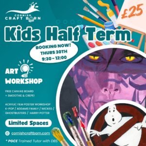 Creative adventures in drawing and painting with acrylics on canvas. A half-term workshop for budding artists aged 8 to 14 to create a movie poster on a canvas to hang on bedroom walls for Halloween! K-POP, Wicked and Ghostbusters are our poster themes. Examples and quick templates will be available, along with tuition and assistance, to help you create these Halloween works of art.