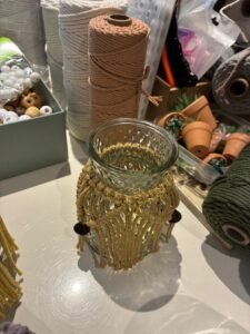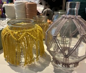 There will be a choice of glassware available, but if you have anything at home you would like to add your design to, please bring it along. The only requirement is that the glass container has a neck or lip. TheMacramé yarn is not glued to the container, so can be removed later.